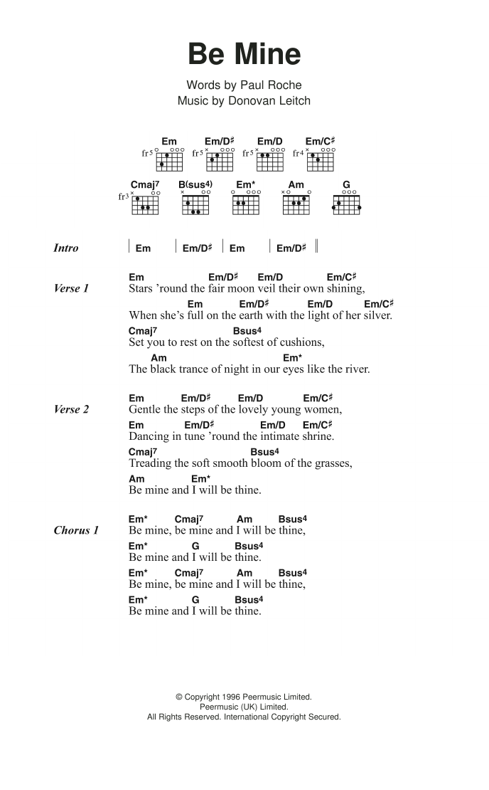 Download or print Donovan Be Mine sheet music, chords and digital score arranged for Guitar Chords/Lyrics. This Folk score includes 2 page(s).