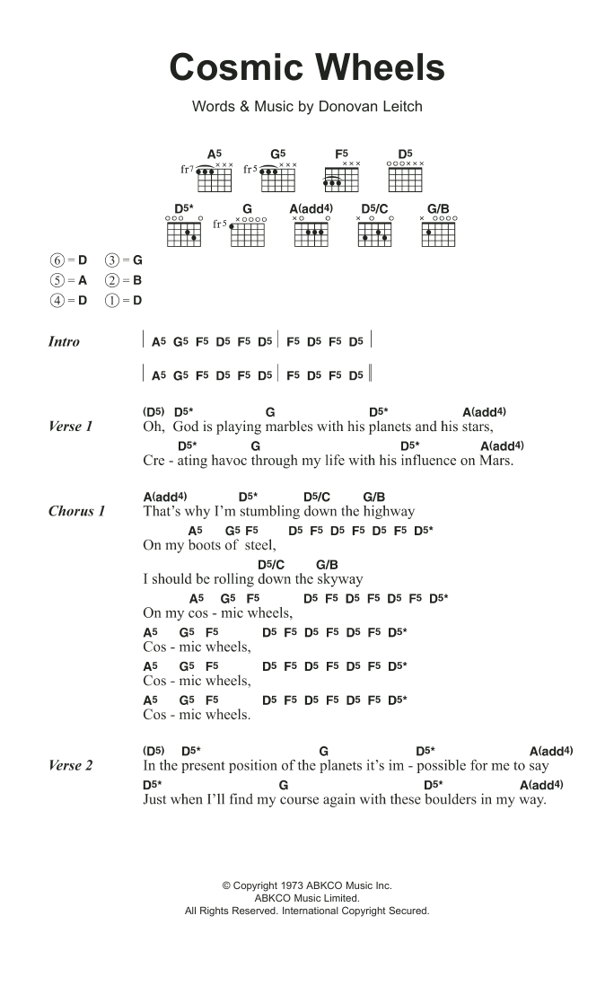 Download or print Donovan Cosmic Wheels sheet music, chords and digital score arranged for Guitar Chords/Lyrics. This Folk score includes 2 page(s).