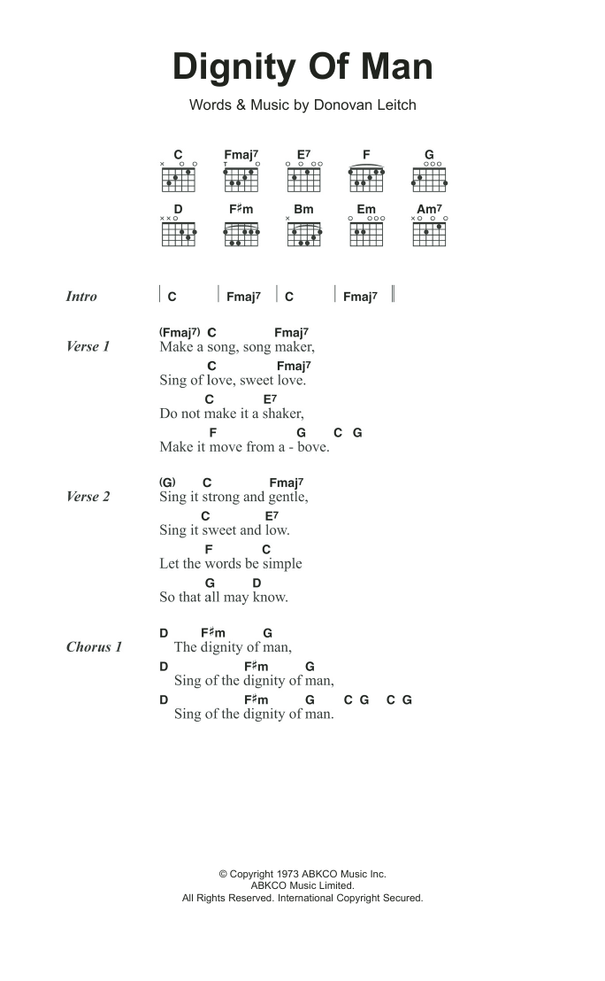 Download or print Donovan Dignity Of Man sheet music, chords and digital score arranged for Guitar Chords/Lyrics. This Folk score includes 2 page(s).