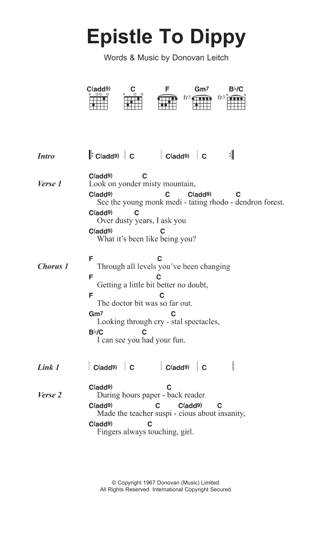 Download or print Donovan Epistle To Dippy sheet music, chords and digital score arranged for Guitar Chords/Lyrics. This Folk score includes 3 page(s).