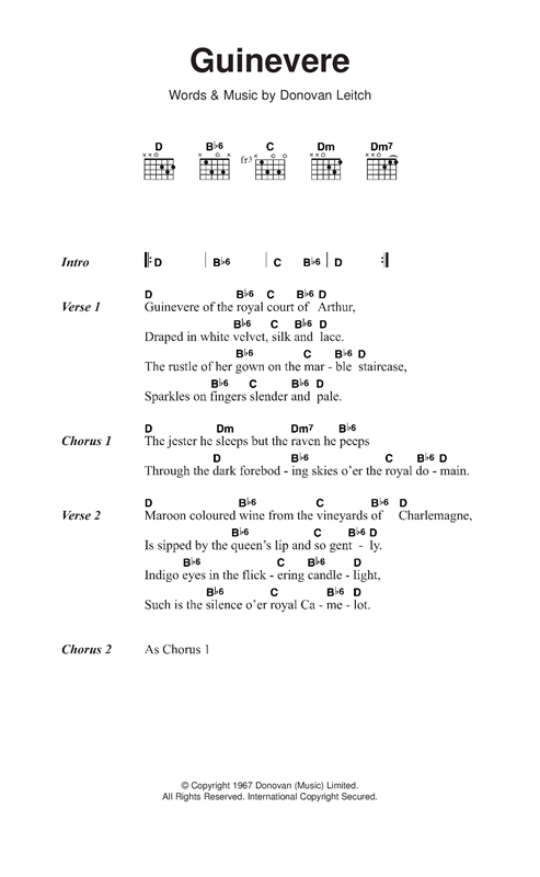 Download or print Donovan Guinevere sheet music, chords and digital score arranged for Guitar Chords/Lyrics. This Folk score includes 2 page(s).