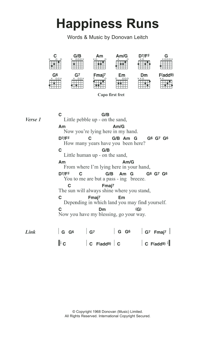 Download or print Donovan Happiness Runs sheet music, chords and digital score arranged for Guitar Chords/Lyrics. This Folk score includes 2 page(s).