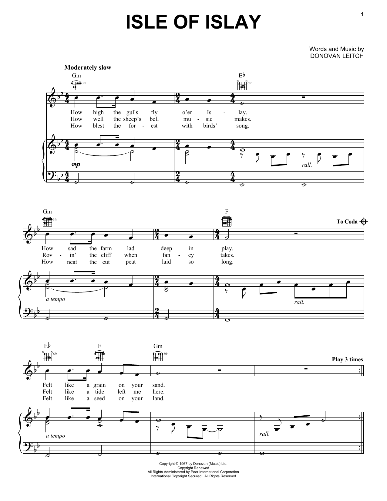 Download or print Donovan Isle Of Islay sheet music, chords and digital score arranged for Guitar Chords/Lyrics. This Folk score includes 2 page(s).