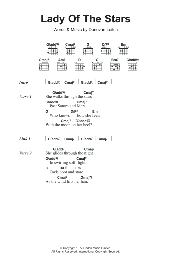Download or print Donovan Lady Of The Stars sheet music, chords and digital score arranged for Guitar Chords/Lyrics. This Folk score includes 2 page(s).