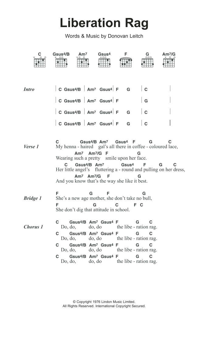 Download or print Donovan Liberation Rag sheet music, chords and digital score arranged for Guitar Chords/Lyrics. This Folk score includes 2 page(s).