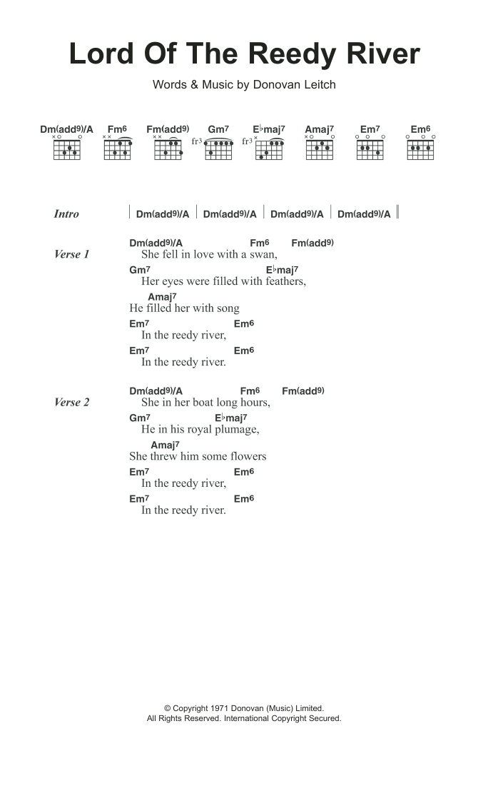 Download or print Donovan Lord Of The Reedy River sheet music, chords and digital score arranged for Guitar Chords/Lyrics. This Folk score includes 2 page(s).