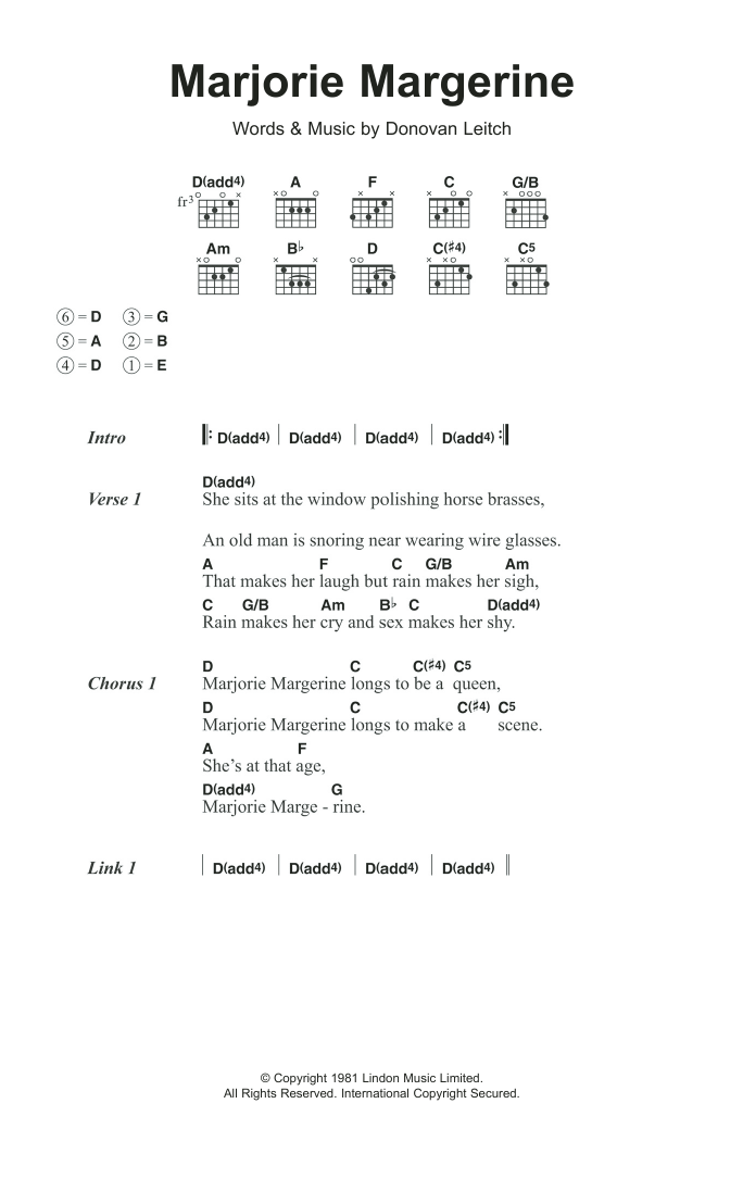 Download or print Donovan Marjorie Margerine sheet music, chords and digital score arranged for Guitar Chords/Lyrics. This Folk score includes 2 page(s).