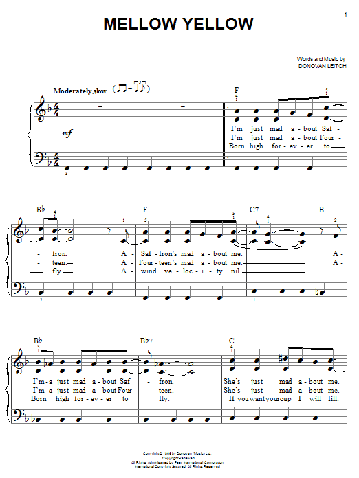 Download or print Donovan Mellow Yellow sheet music, chords and digital score arranged for Solo Guitar. This Oldies score includes 5 page(s).