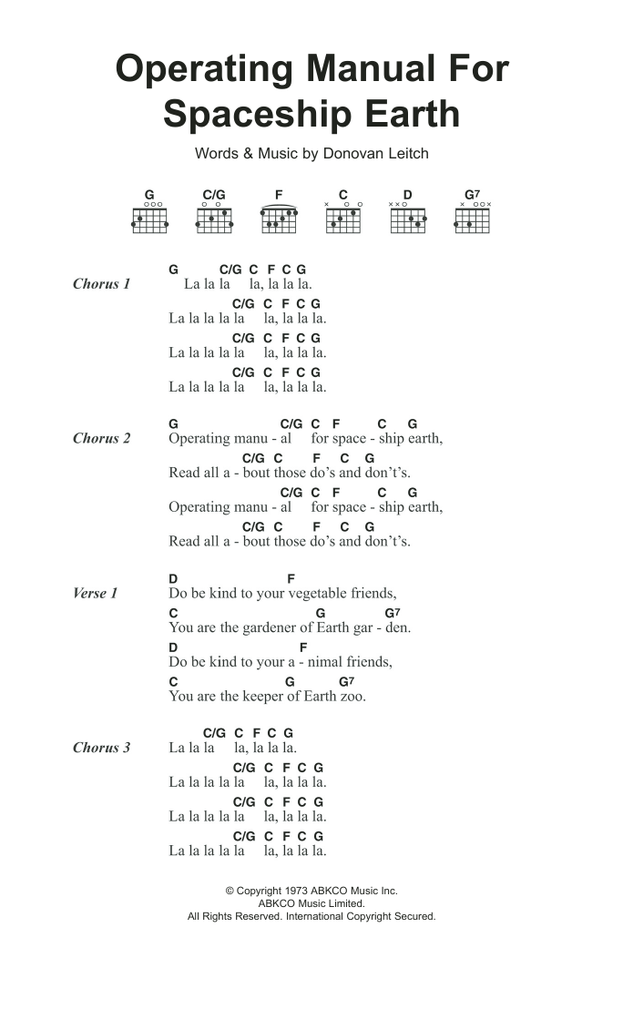 Download or print Donovan Operating Manual For Spaceship Earth sheet music, chords and digital score arranged for Guitar Chords/Lyrics. This Folk score includes 2 page(s).
