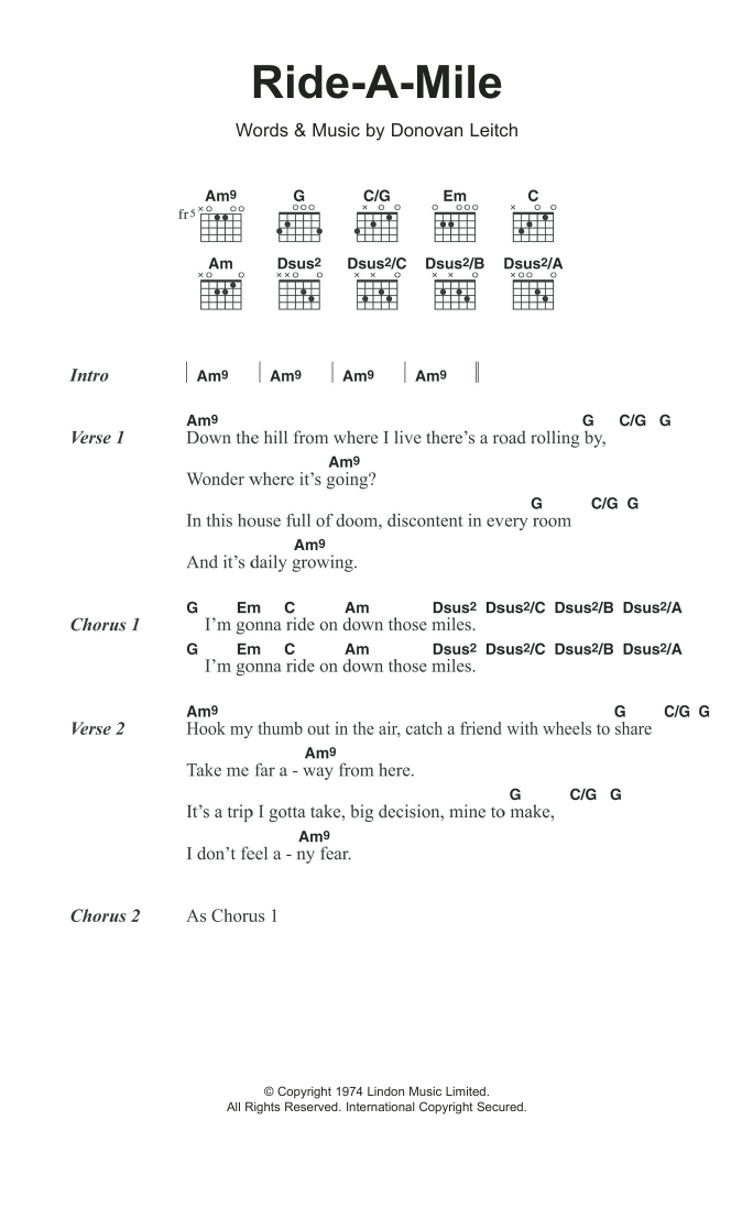 Download or print Donovan Ride A Mile sheet music, chords and digital score arranged for Guitar Chords/Lyrics. This Folk score includes 2 page(s).