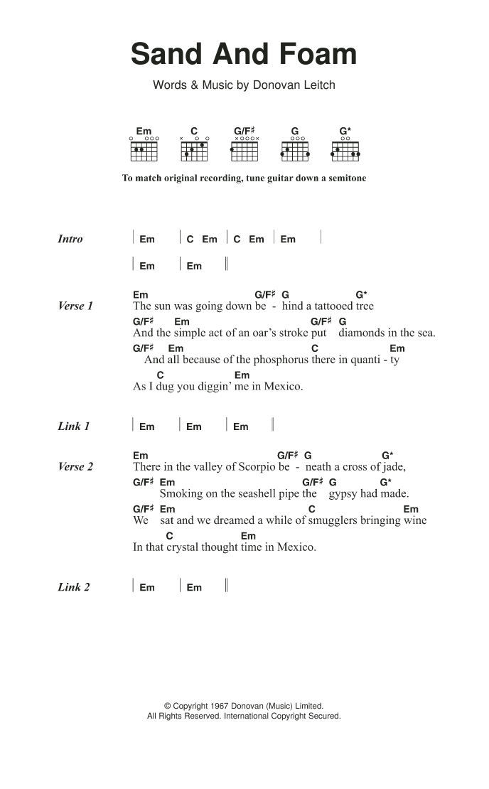 Download or print Donovan Sand And Foam sheet music, chords and digital score arranged for Guitar Chords/Lyrics. This Folk score includes 2 page(s).