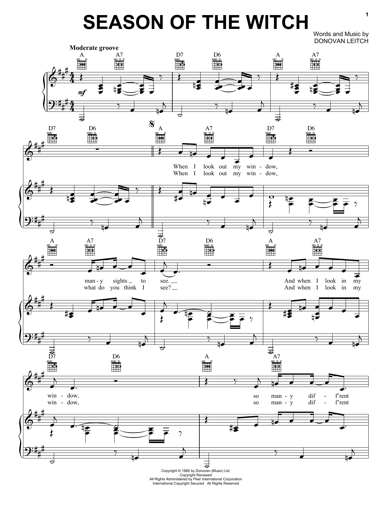 Download or print Donovan Season Of The Witch sheet music, chords and digital score arranged for Piano, Vocal & Guitar Chords (Right-Hand Melody). This Folk score includes 8 page(s).