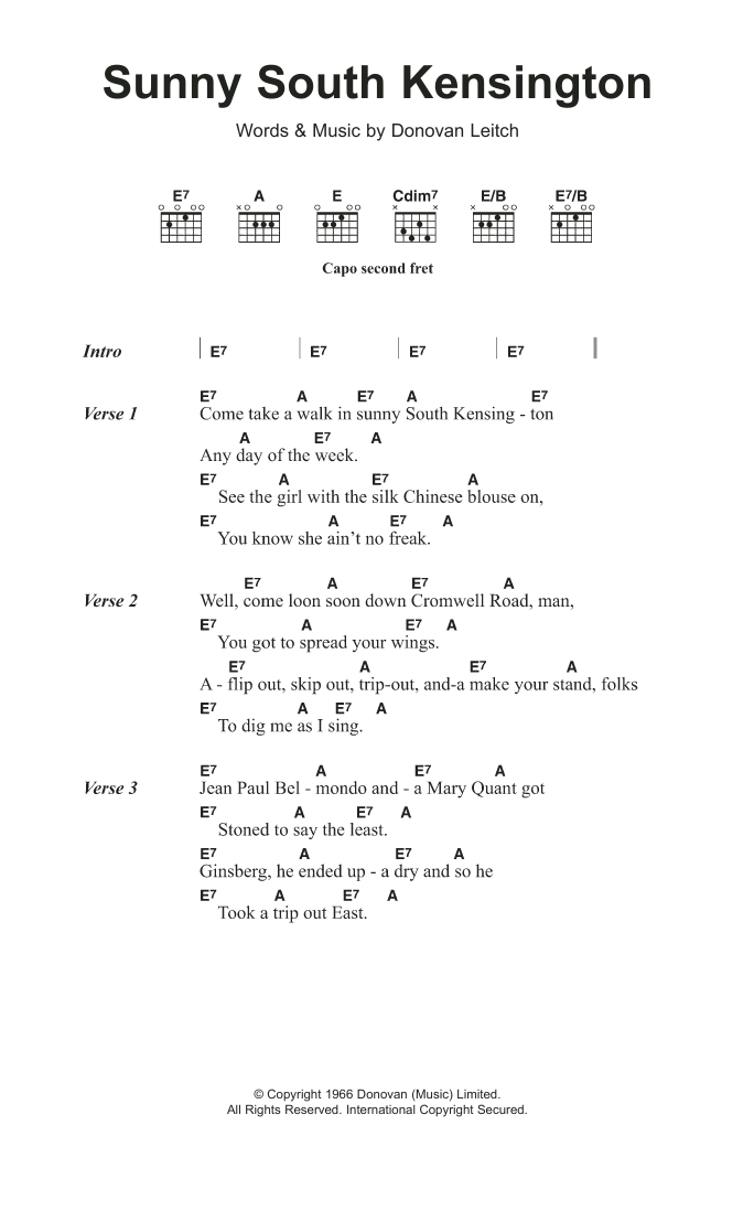 Download or print Donovan Sunny South Kensington sheet music, chords and digital score arranged for Guitar Chords/Lyrics. This Folk score includes 3 page(s).