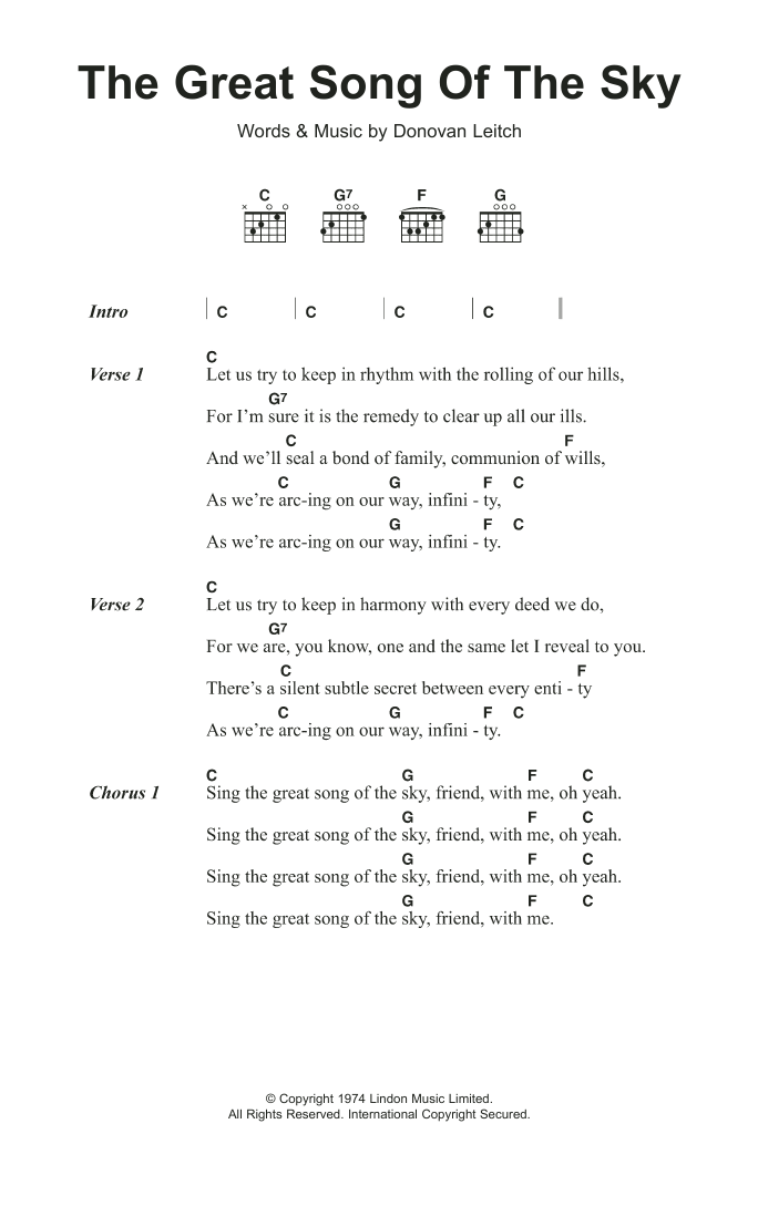 Download or print Donovan The Great Song Of The Sky sheet music, chords and digital score arranged for Guitar Chords/Lyrics. This Folk score includes 2 page(s).