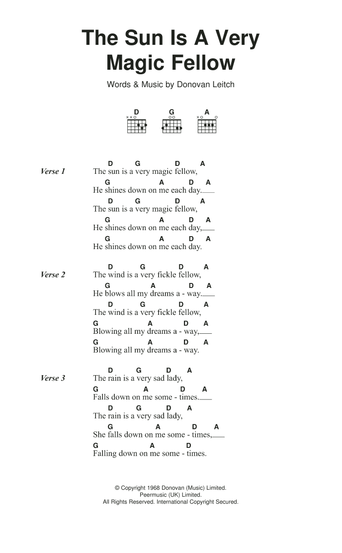 Download or print Donovan The Sun Is A Very Magic Fellow sheet music, chords and digital score arranged for Guitar Chords/Lyrics. This Folk score includes 3 page(s).