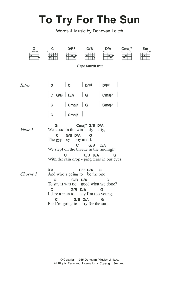 Download or print Donovan Try For The Sun sheet music, chords and digital score arranged for Guitar Chords/Lyrics. This Folk score includes 3 page(s).