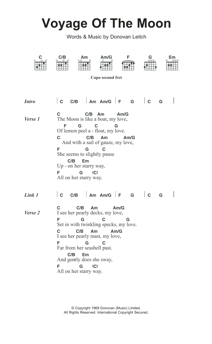 Download or print Donovan Voyage Of The Moon sheet music, chords and digital score arranged for Guitar Chords/Lyrics. This Folk score includes 3 page(s).
