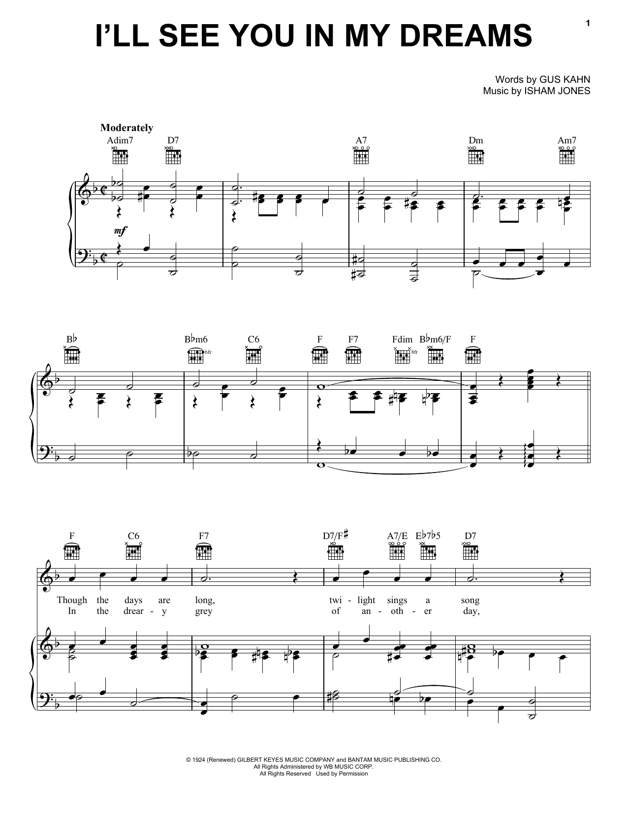 Download or print Doris Day I'll See You In My Dreams sheet music, chords and digital score arranged for Piano, Vocal & Guitar Chords (Right-Hand Melody). This Film/TV score includes 5 page(s).