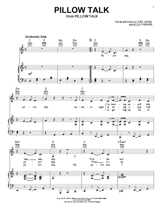 Download or print Doris Day Pillow Talk sheet music, chords and digital score arranged for Piano, Vocal & Guitar Chords (Right-Hand Melody). This Standards score includes 4 page(s).