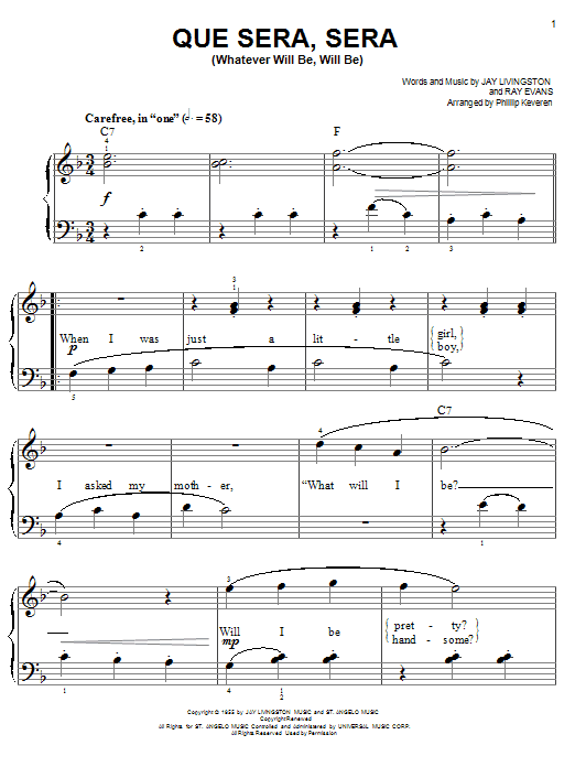 Download or print Doris Day Que Sera, Sera (Whatever Will Be, Will Be) (arr. Phillip Keveren) sheet music, chords and digital score arranged for Easy Piano. This Pop score includes 3 page(s).