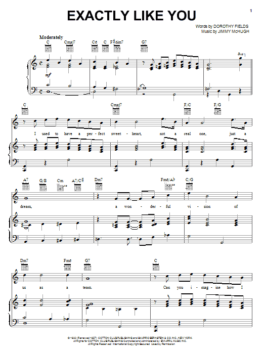 Download or print Dorothy Fields Exactly Like You sheet music, chords and digital score arranged for Real Book – Melody & Chords – C Instruments. This Jazz score includes 1 page(s).