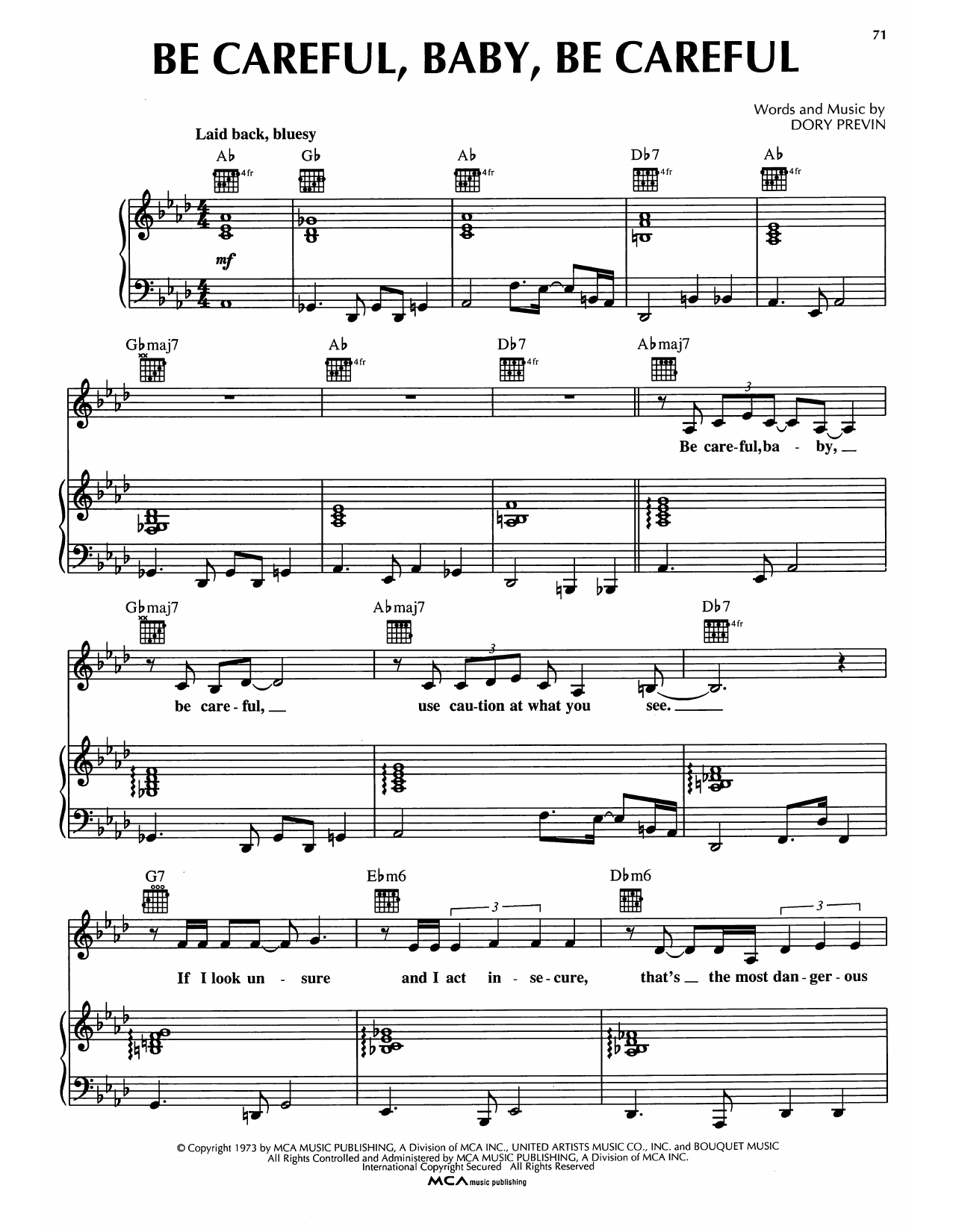 Download or print Dory Previn Be Careful, Baby, Be Careful sheet music, chords and digital score arranged for Piano, Vocal & Guitar Chords (Right-Hand Melody). This Pop score includes 9 page(s).