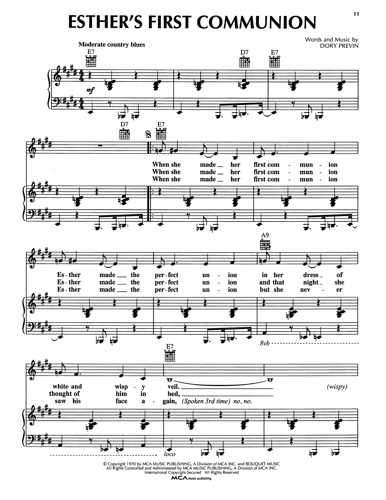 Download or print Dory Previn Esther's First Communion sheet music, chords and digital score arranged for Piano, Vocal & Guitar Chords (Right-Hand Melody). This Pop score includes 8 page(s).
