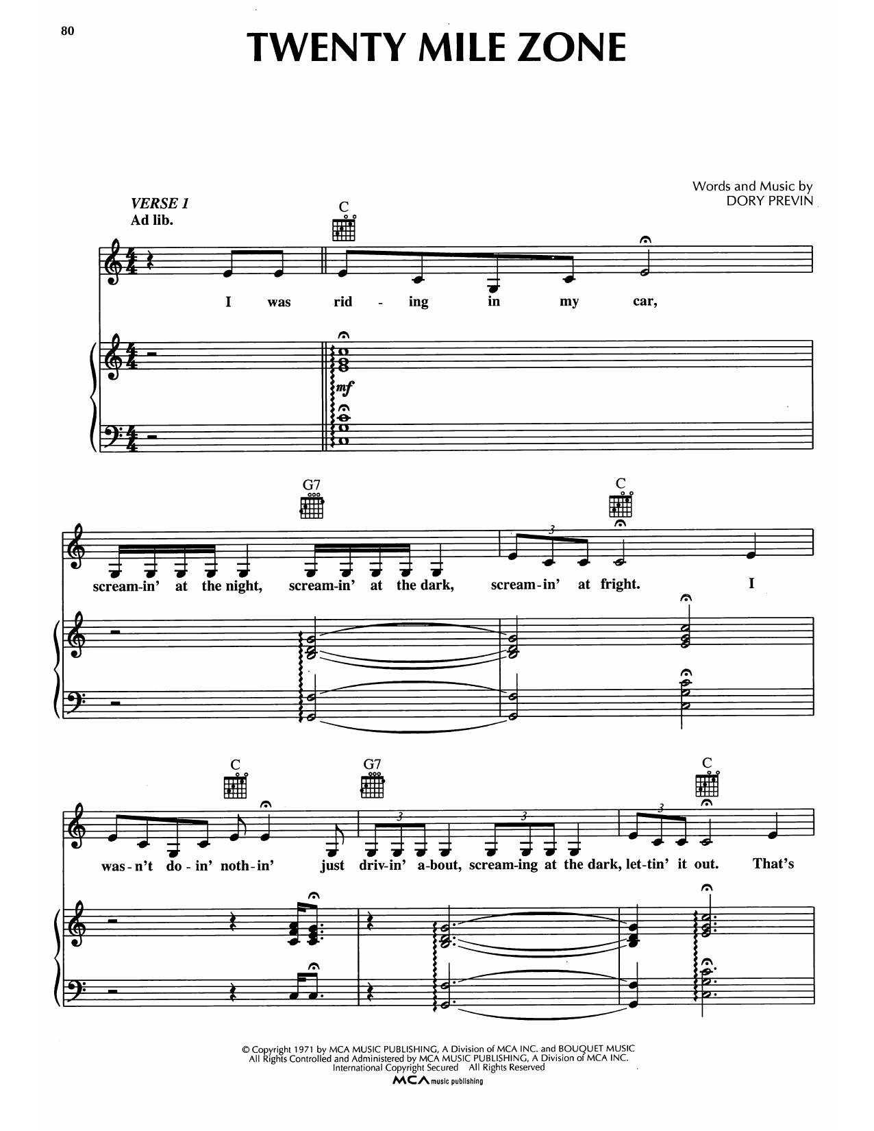 Download or print Dory Previn Twenty Mile Zone sheet music, chords and digital score arranged for Piano, Vocal & Guitar Chords (Right-Hand Melody). This Pop score includes 10 page(s).