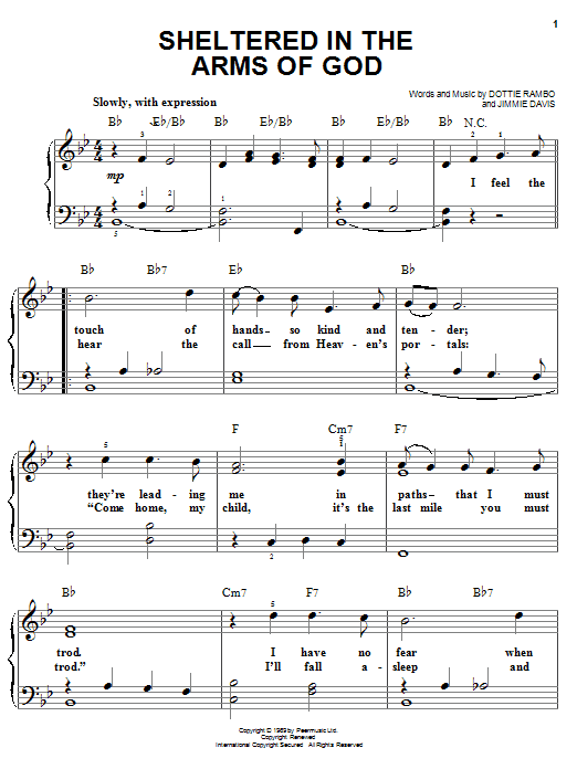 Download or print Dottie Rambo Sheltered In The Arms Of God sheet music, chords and digital score arranged for Easy Piano. This Country score includes 3 page(s).
