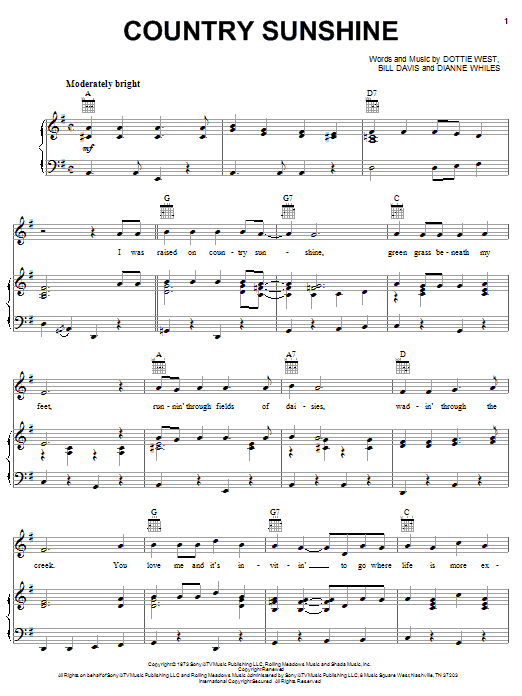 Download or print Dottie West Country Sunshine sheet music, chords and digital score arranged for Piano, Vocal & Guitar Chords (Right-Hand Melody). This Country score includes 4 page(s).