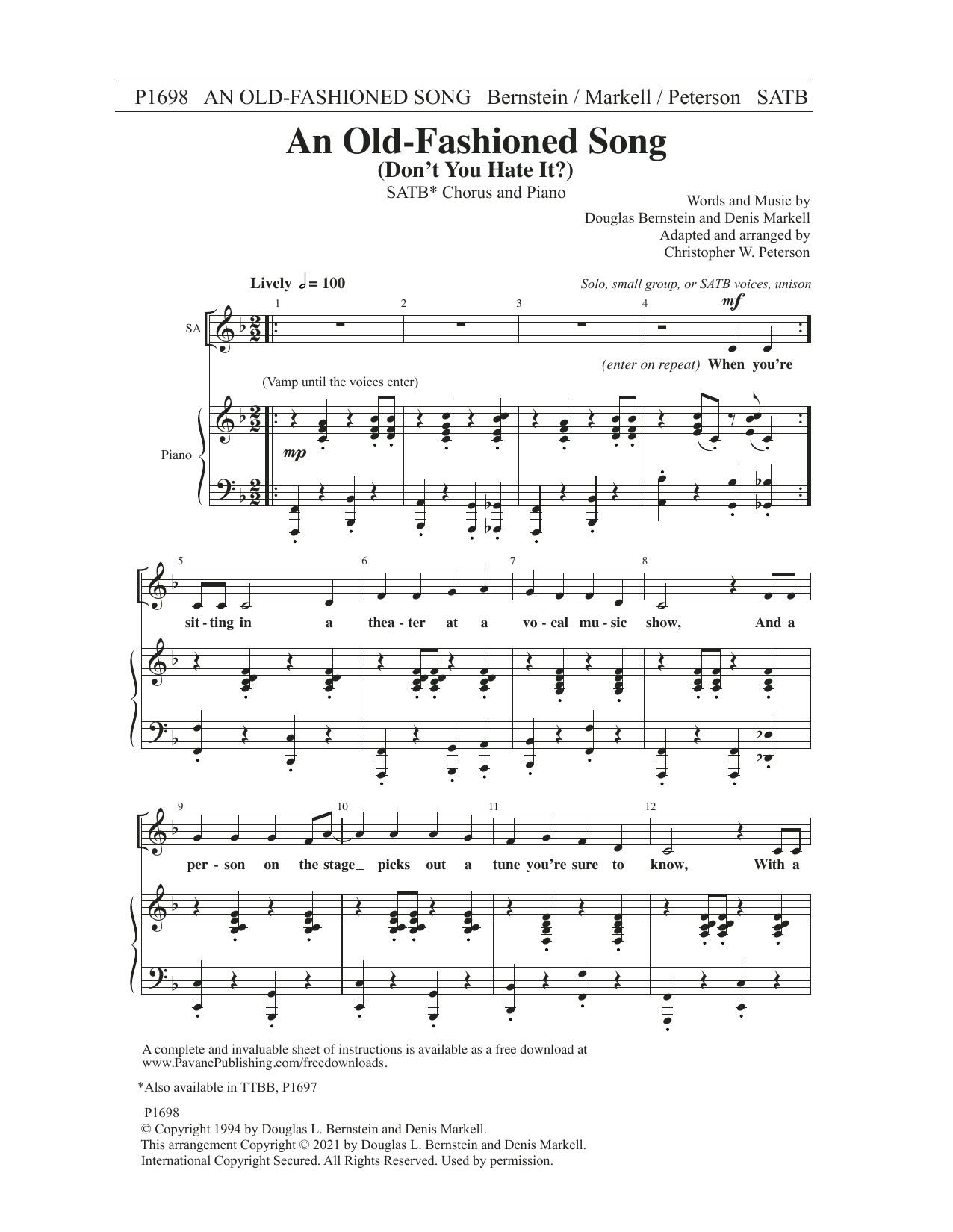Download or print Douglas Bernstein and Denis Markell An Old-Fashioned Song (Don't You Hate It?) (arr. Christopher Peterson) sheet music, chords and digital score arranged for SATB Choir. This Concert score includes 16 page(s).
