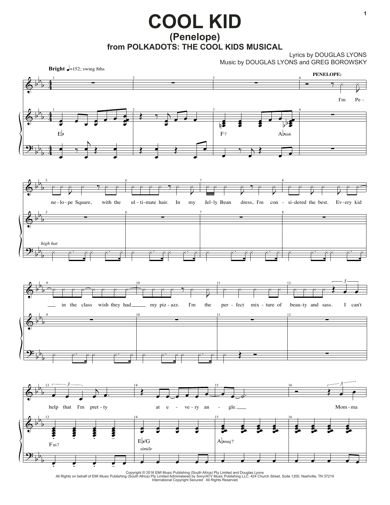 Download or print Douglas Lyons & Greg Borowsky Cool Kid sheet music, chords and digital score arranged for Piano & Vocal. This Children score includes 9 page(s).