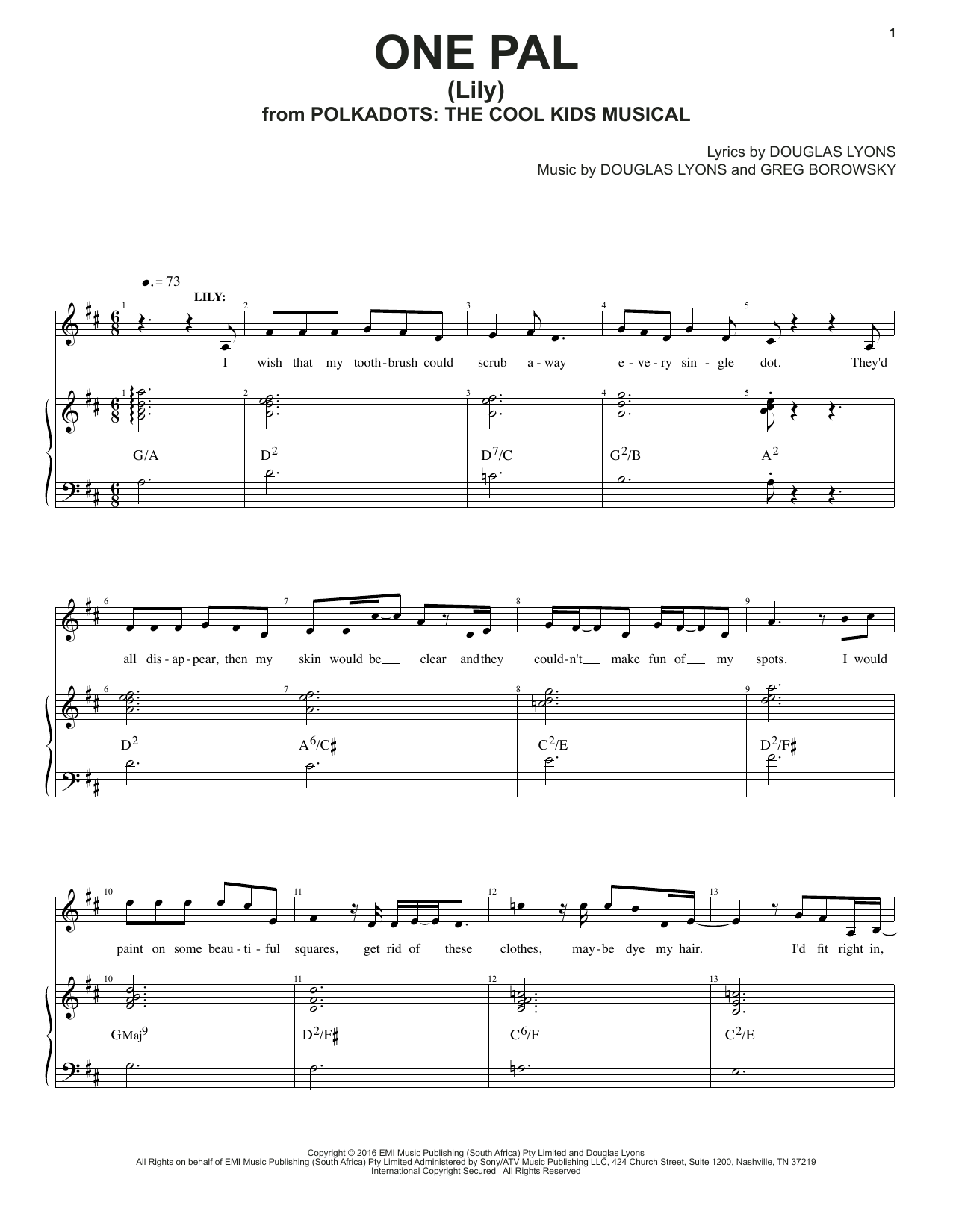 Download or print Douglas Lyons & Greg Borowsky One Pal sheet music, chords and digital score arranged for Piano & Vocal. This Children score includes 5 page(s).