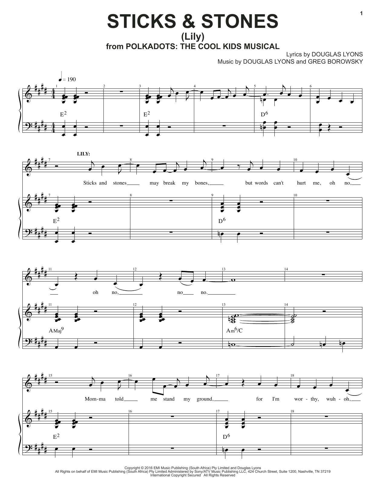 Download or print Douglas Lyons & Greg Borowsky Sticks & Stones sheet music, chords and digital score arranged for Piano & Vocal. This Children score includes 6 page(s).