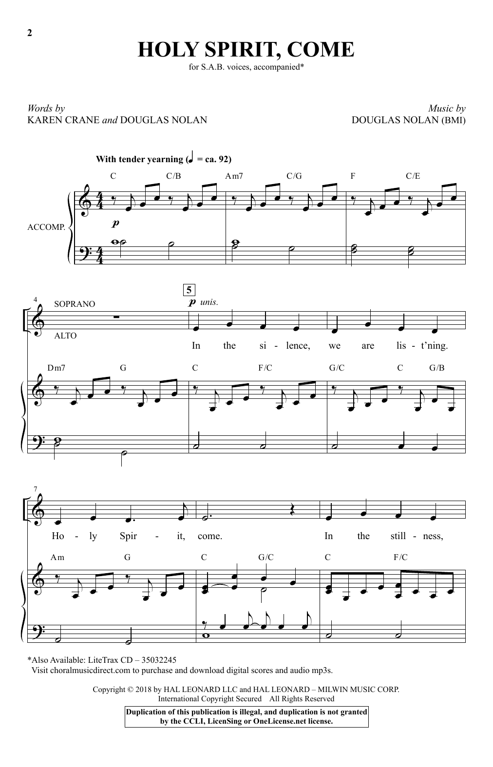 Download or print Douglas Nolan Holy Spirit, Come sheet music, chords and digital score arranged for SAB Choir. This Concert score includes 9 page(s).