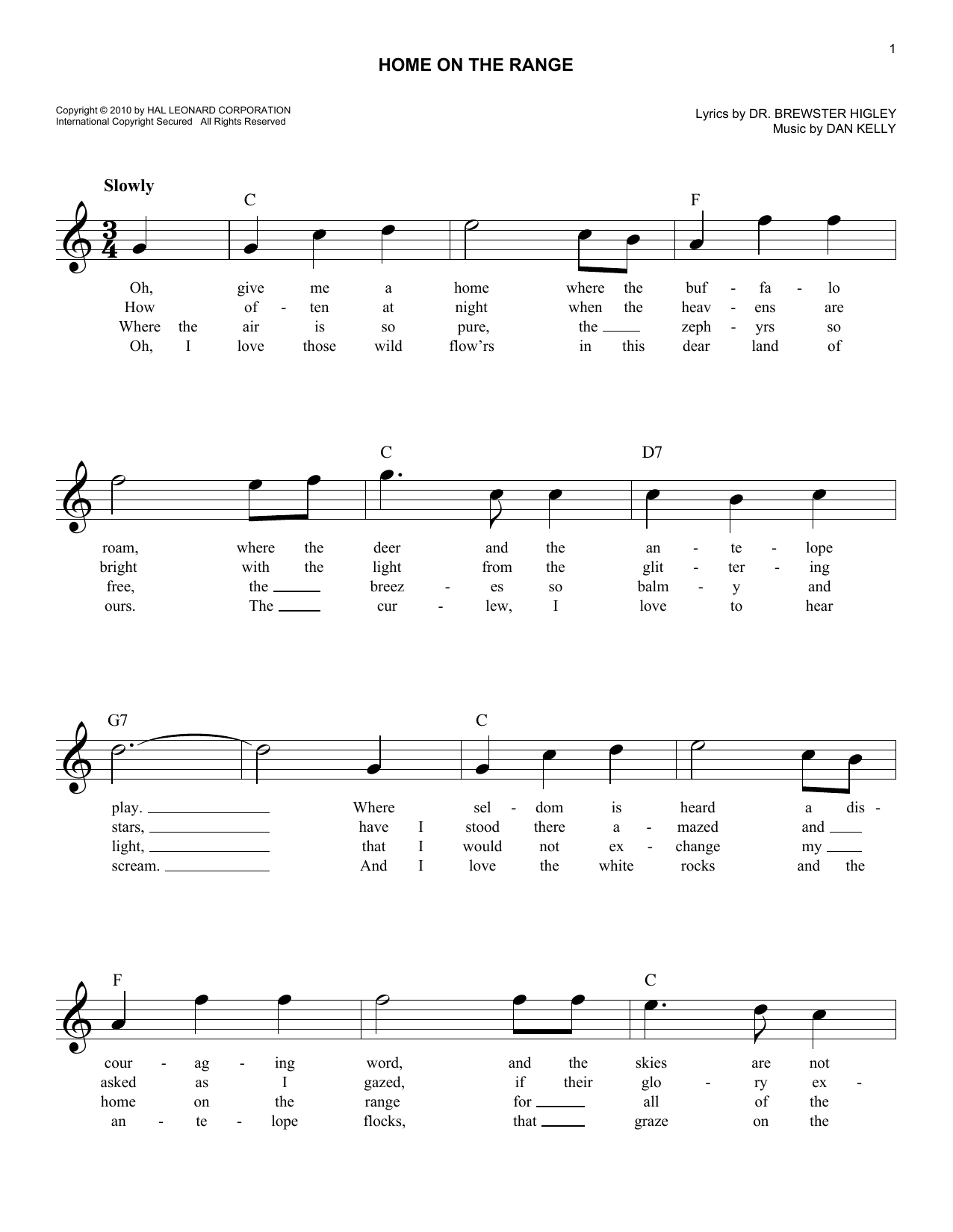 Download or print Dr. Brewster Higley Home On The Range sheet music, chords and digital score arranged for Easy Lead Sheet / Fake Book. This Children score includes 2 page(s).