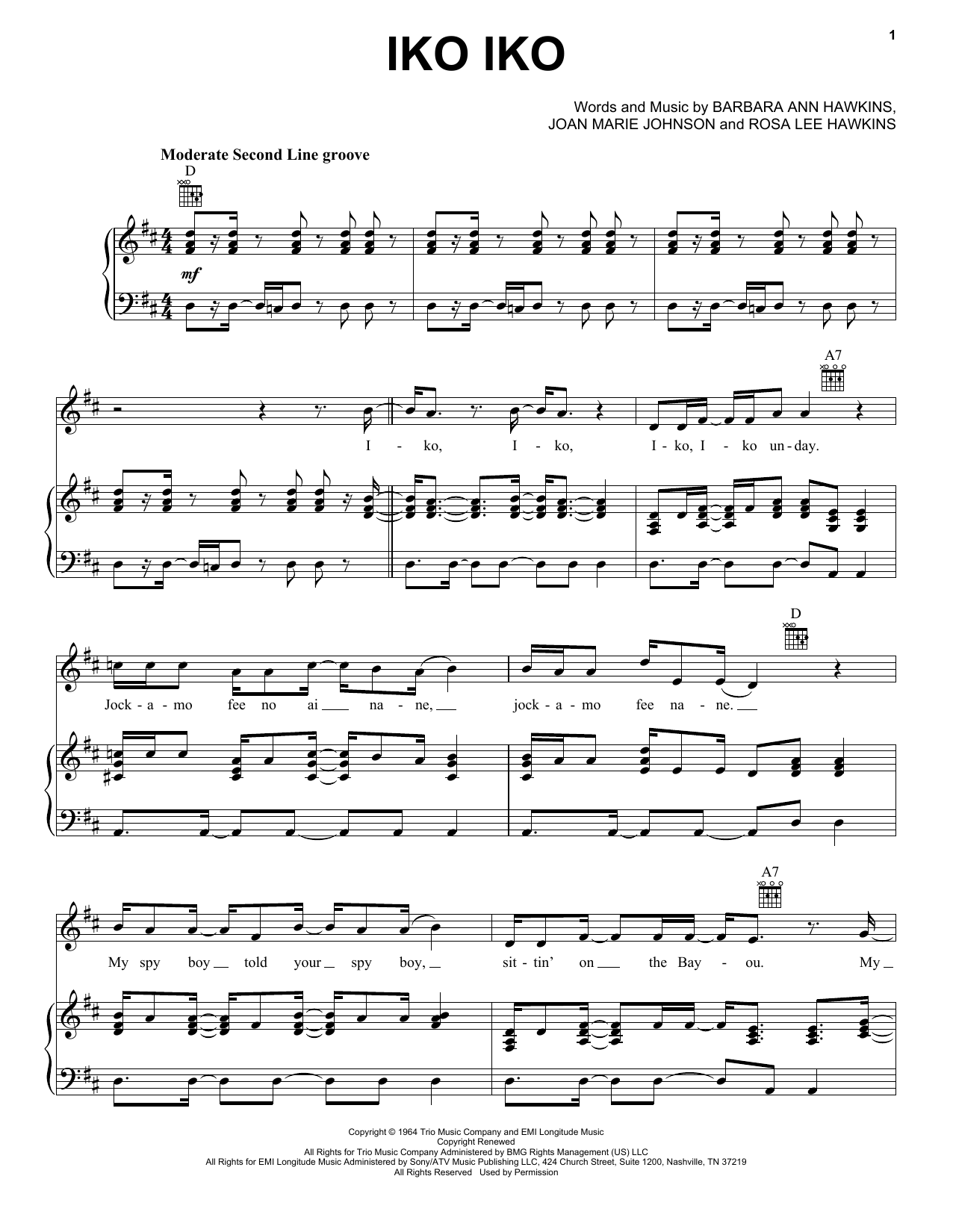 Download or print Dr. John Iko Iko sheet music, chords and digital score arranged for Piano, Vocal & Guitar Chords (Right-Hand Melody). This Jazz score includes 6 page(s).