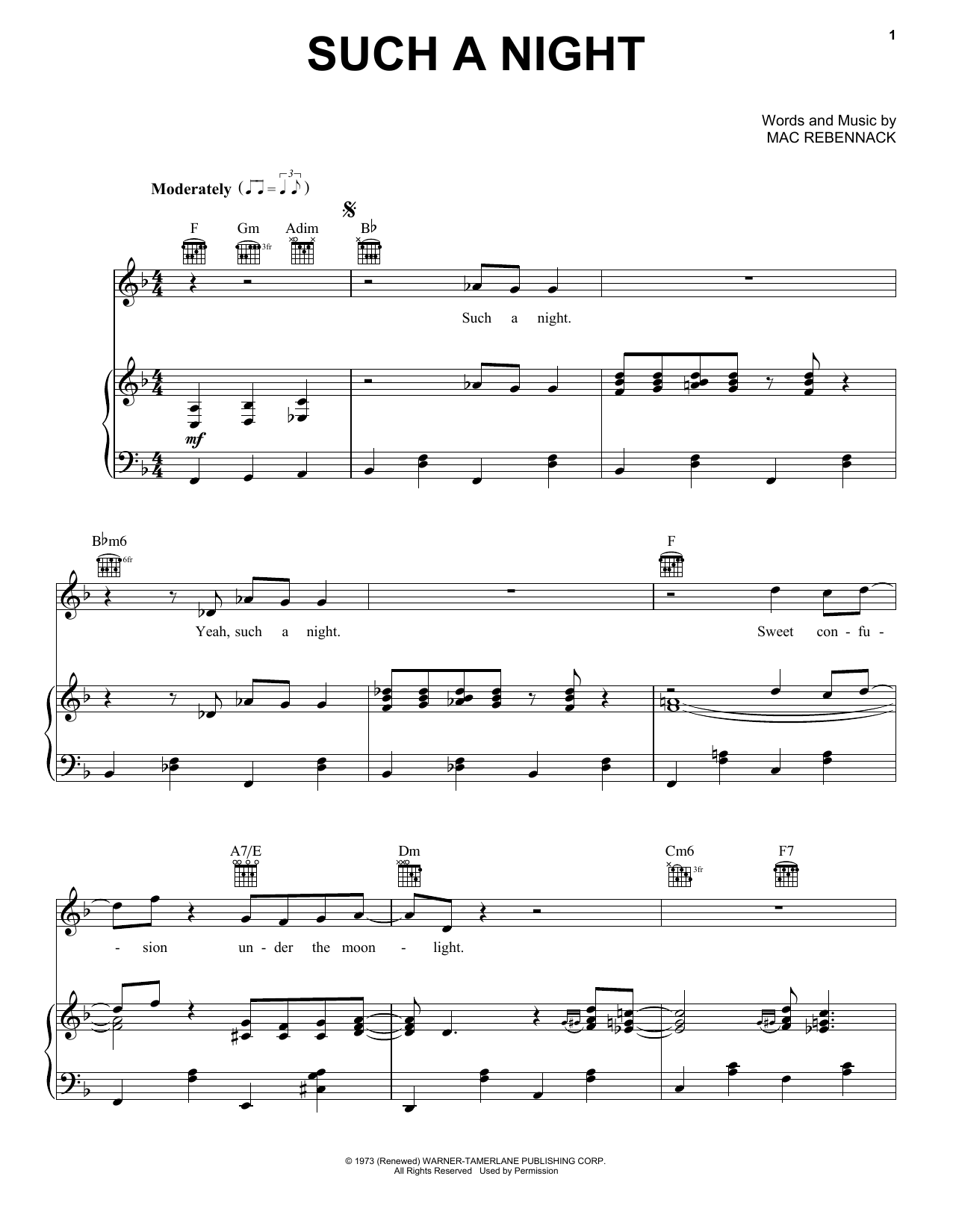 Download or print Dr. John Such A Night sheet music, chords and digital score arranged for Piano, Vocal & Guitar Chords (Right-Hand Melody). This Jazz score includes 6 page(s).