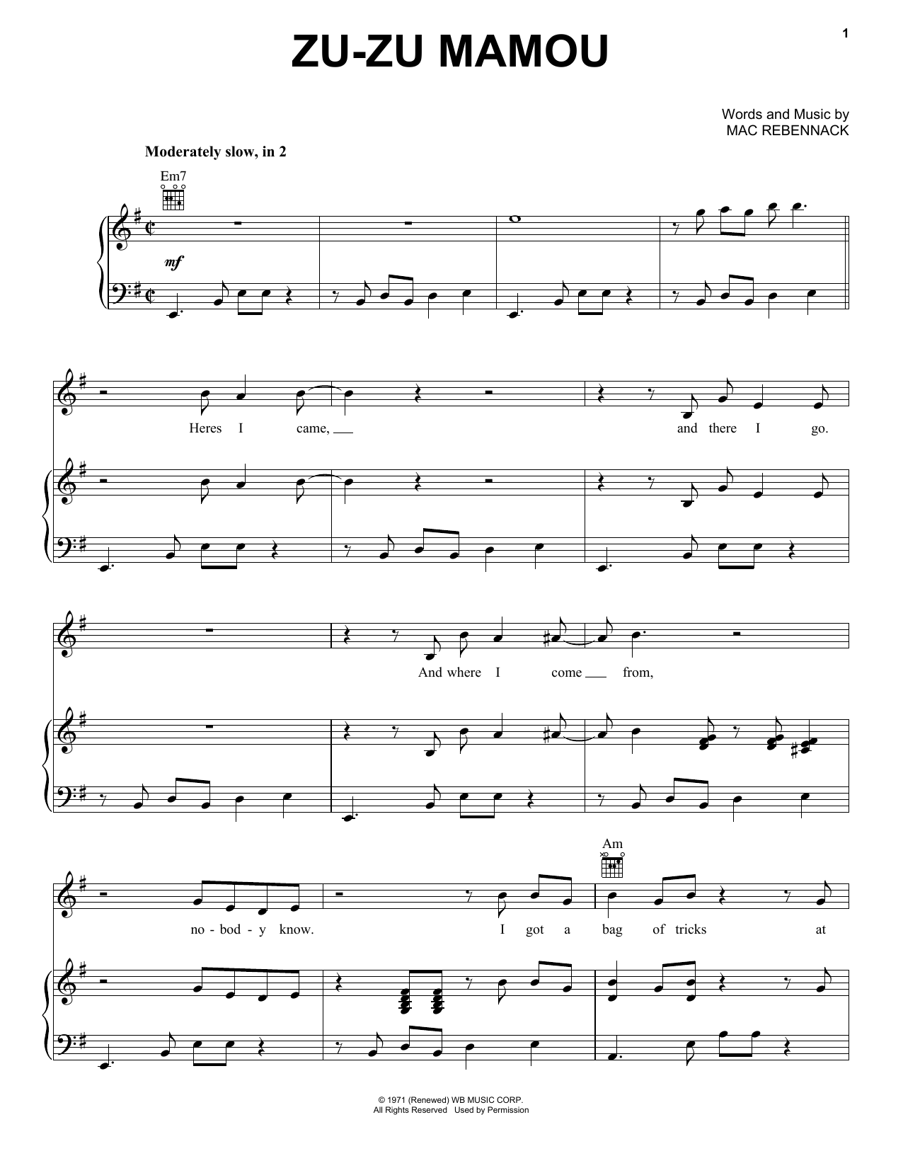 Download or print Dr. John Zu-Zu Mamou sheet music, chords and digital score arranged for Piano, Vocal & Guitar Chords (Right-Hand Melody). This Jazz score includes 6 page(s).