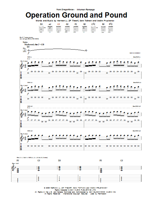 Download or print Dragonforce Operation Ground And Pound sheet music, chords and digital score arranged for Guitar Tab. This Metal score includes 39 page(s).