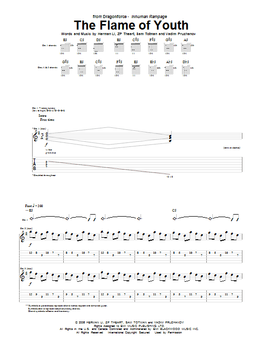 Download or print Dragonforce The Flame Of Youth sheet music, chords and digital score arranged for Guitar Tab. This Metal score includes 40 page(s).