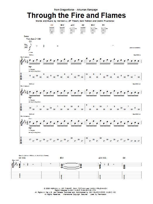 Download or print Dragonforce Through The Fire And Flames sheet music, chords and digital score arranged for Guitar Tab. This Metal score includes 41 page(s).