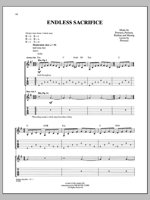 Download or print Dream Theater Endless Sacrifice sheet music, chords and digital score arranged for Guitar Tab. This Metal score includes 19 page(s).