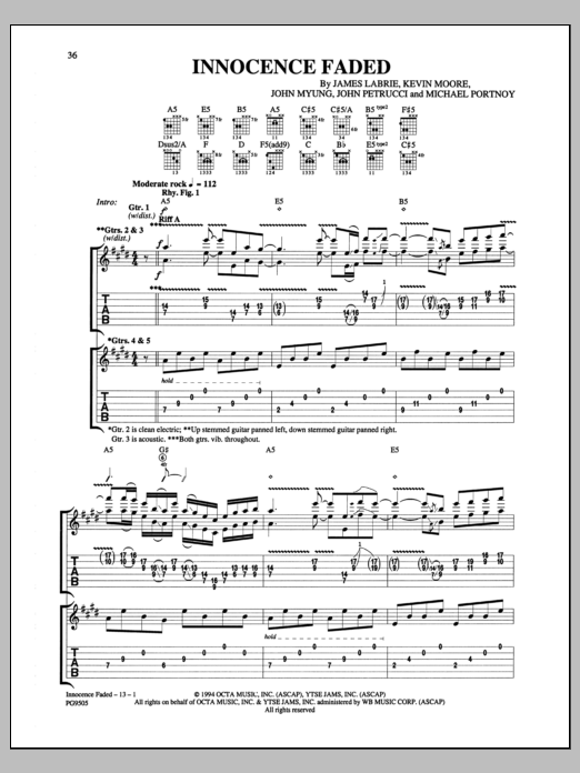 Download or print Dream Theater Innocence Faded sheet music, chords and digital score arranged for Guitar Tab. This Pop score includes 13 page(s).