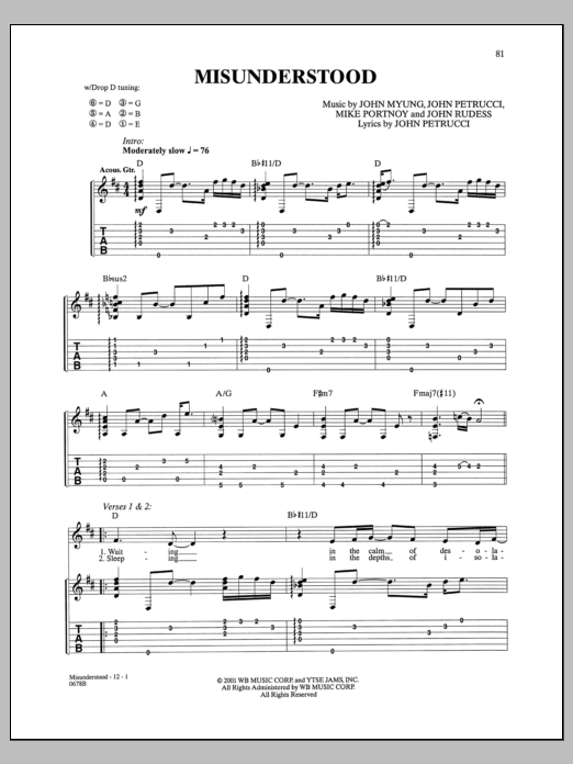 Download or print Dream Theater Misunderstood sheet music, chords and digital score arranged for Guitar Tab. This Pop score includes 12 page(s).