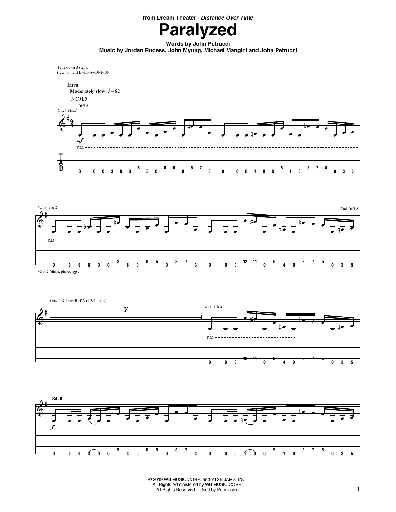 Download or print Dream Theater Paralyzed sheet music, chords and digital score arranged for Guitar Tab. This Rock score includes 9 page(s).