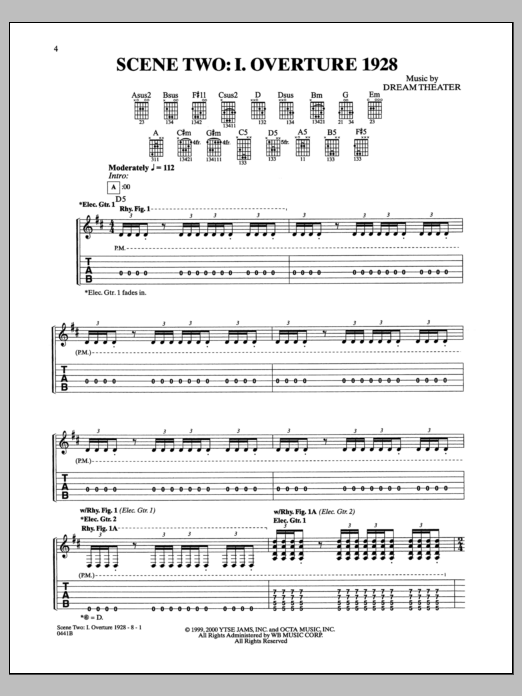 Download or print Dream Theater Scene Two: I. Overture 1928 sheet music, chords and digital score arranged for Guitar Tab. This Pop score includes 8 page(s).