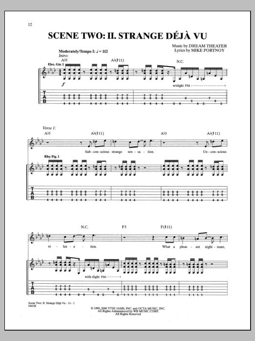 Download or print Dream Theater Scene Two: II. Strange Deja Vu sheet music, chords and digital score arranged for Guitar Tab. This Pop score includes 14 page(s).