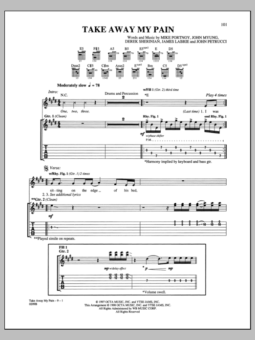 Download or print Dream Theater Take Away My Pain sheet music, chords and digital score arranged for Guitar Tab. This Pop score includes 9 page(s).