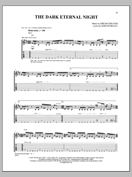 Download or print Dream Theater The Dark Eternal Night sheet music, chords and digital score arranged for Guitar Tab. This Metal score includes 18 page(s).